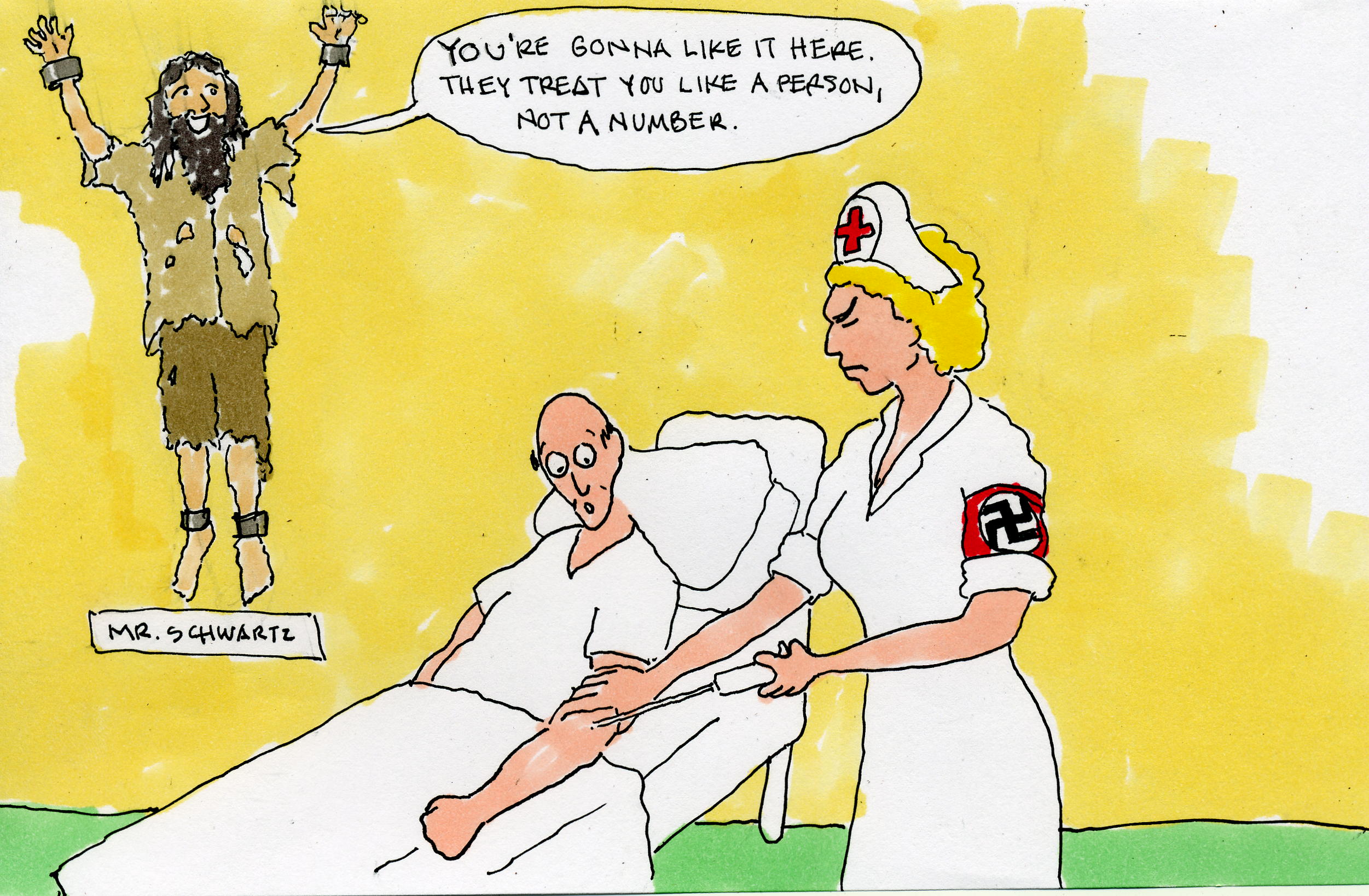 Ode to Mein NurseYou held my hand in comfort You covered me with blankets of wool But you came not to me when I rang the bell My bedpan, for hours, was full Your nursing compassion is way out of fashion You woke me up for a damn sleeping pill But listen to me Ma’am, only here for an out- patient exam It is to your credit that now that I’m ill Your generous rations, five days of starvation You provided me with absolutely nothing for pain With a bed full of beetles, and a behind shot with needles At which Russian Gulag did you once train? I laid in the mud as you professionally drew out my blood My arm was a discolored road map My neck necroses black as you messaged my sore back Getting ready for your Samurai spinal tap I lost one complete size though I left this hospital alive My life has learned a new point of view With a cast iron heart, you took one heroic part Fighting for the wrong side, in World War number Two Send this Whackocard to your friends! |