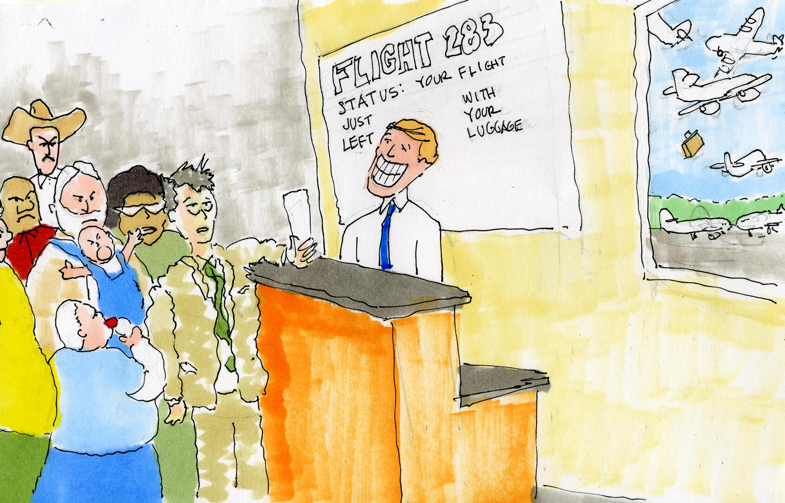 Ode to an AirlineThe flight at nine-fifteen was now taking off Only a mere two hours late I missed my connection in Cincinnati at noon I was left stranded alone at the gate I told the ticket manager of all my sorrows He in turn was wearing all smiles A roach infected dive I found myself sleeping For one thousand Frequent Flyer Miles When finally arriving in beautiful San Francisco I do say I was a little bit sore Viewing the scenery at Fisherman’s Wharf My luggage was on tour in Baltimore They say the flying skies are severely overcrowded The flight schedules are just insane But the next time it’s time for me to travel You can be sure, I will be taking the train Send this Whackocard to your friends! |