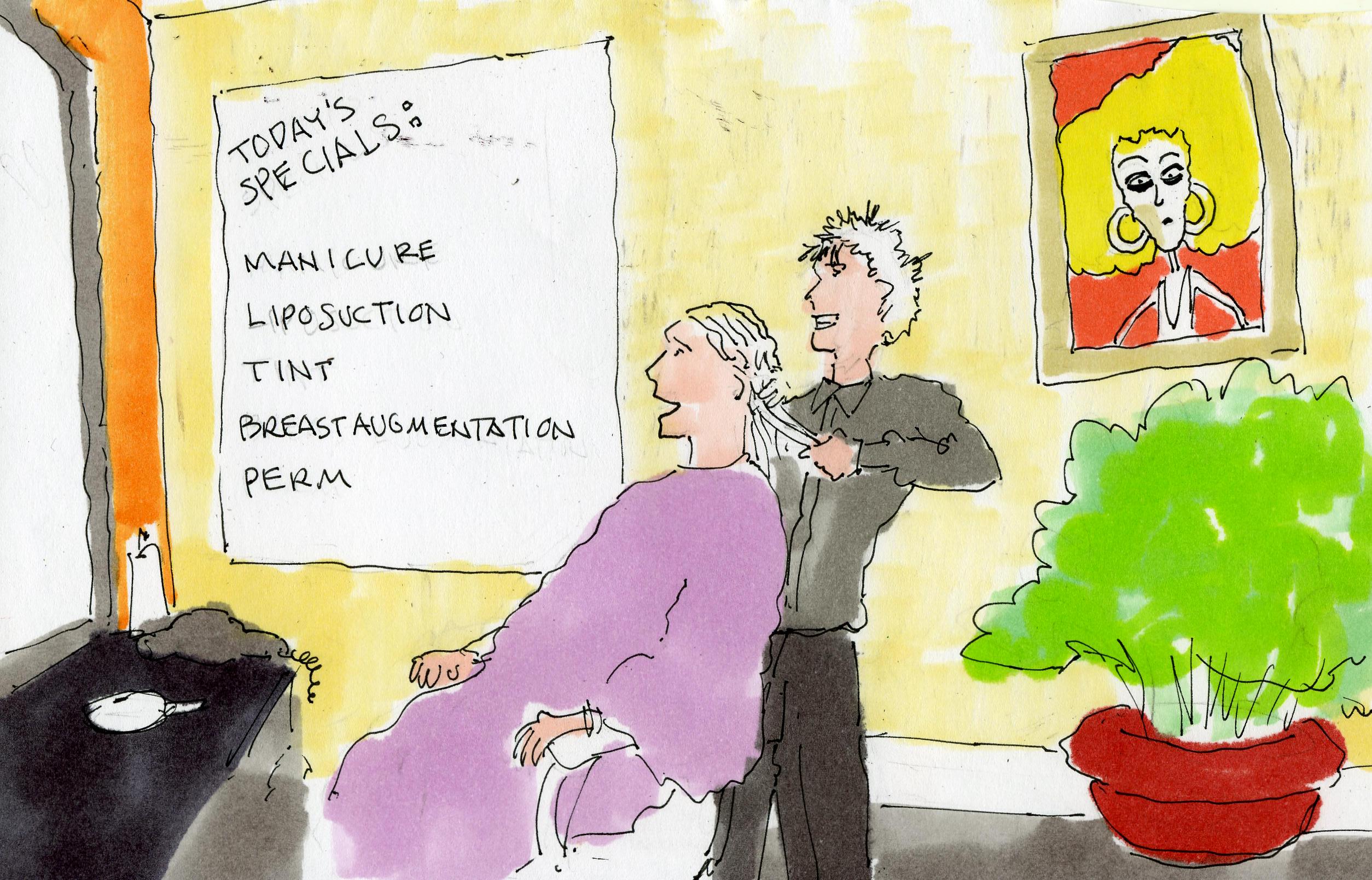Thank You for the 21st Century Beauty SalonThank You for the 21st Century Beauty Salon Your gift card for the day was a thoughtful favor Get unwanted gray removed from out of your hair While discussing everybody’s next door neighbor Flush the dry skin from out of your scalp “Did you know Mrs. Smith found herself a new rich geezer?” View the fashions of Paris today “We have some “Do”, I know, which will please her” My skin was clogged in all the pores My nails bitten to the nub were not ready I combed my hair with an eggbeater then It resembled a side dish of spaghetti Designing “The Bomb” was a comparable breeze Seem my eyes and my nose are now mergin’ During the day at the 21st Century Beauty Salon It was now time for my personal plastic surgeon “Today you’re in luck, get a discount tummy tuck Have your abdomen now made up out of steel No more unwanted dead space, a Botox shot to your lined face We will add to you life’s sex appeal” “Collagen to your lip, varicose veins we will strip Lifting your eyelids so they will no longer droop Vogue may make you pose, after shedding layers of adipose It’s time for you to rejoin the social loop” “Prevent skin decay, here, rub in this magic, Retin A Choose between implants or a simple breast reduction Believe what you are seein”, we will make you a new human bein’ The surgeon’s now ready to proceed, with liposuction” So thank you for the 21st Century Beauty Salon Oh what a difference it made Thank you for the 21st Century Beauty Salon I will be beautiful in the following decade Send this Whackocard to your friends! |