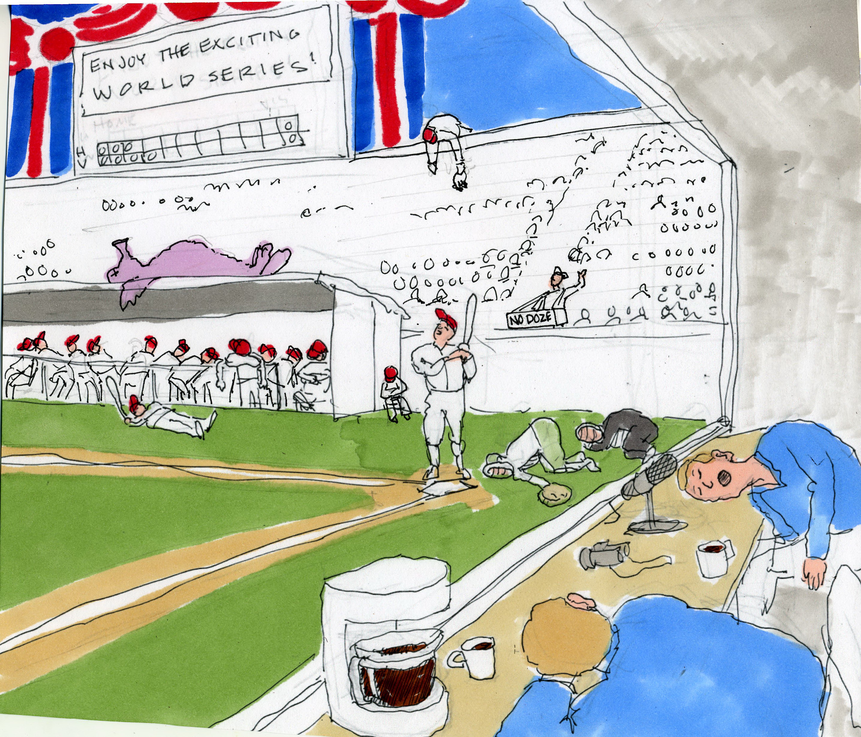 Sorry to Hear You Fell Asleep during the World SeriesSorry to hear you fell asleep during the World Series Those nostalgia days of the Brooklyn Dodgers have me weeping Polluting midnight ads, constitute the sponsor’s greedy theories Youth’s future memories, will be in their beds, soundly sleeping The Yanks and Mets, propels New York’s contagious Series faith Baseball fever is embarking once again It’s one in the morning and it’s still the top of the eighth We will watch the highlights tomorrow on, E.S.P.N. The Brooklyn Dodgers have progressed to mythical lore On their sacred souls, Lord, show some compassionate mercy Most reside on a bench, six feet deep in the outfield floor Pay fifty thousand for a Dodger autographed jersey The player and fan once formed an unbreakable bond I would get depressed for a hitless Duke Snider Magnetic financial lure, facilitates the player to abscond Today the Duke, would be a fat overpaid, Detroit Tiger For every New York Yankee, until death I would defend Memorizing box scores only add to the excitement Now after every pitch, we must accept and contend Here comes another lame pitch, for the next sit-com advertisement The constant war between the hitter and pitcher is always a treat A 99 mile fastball consumes the batter with fulminating terror I’ve paid the scalper, three thousand for this obstructed bleacher seat I paid thirty thousand, to purchase the mitt, of Yogi Berra Our catcher “Big Mike” hit a robust three-eighteen He found his pecuniary contract an insult-oh what a pity He’ll peddle his talents to a more appreciative team Next year, his ass will be behind the plate, in Kansas City Baseball players have earned our highest respect They once complained they were unwanted cattle Learn to throw a slider that a radar gun can’t detect Skip high school, sign up for millions, play for Seattle Jeter’s on first, he’s swift and he is cunning Second base he will be attempting to steal A repetitive station break, the repulsive kind they are running I’d like to crack the bat, on the rump, of Ali McBeal As the T.V. camera pans the crowd, Hollywood Stars appear ingratiating Every player receives a resounding emotional clap There’s nothing in the world, that can be quite as nauseating As seeing a smiling Hilliary, adorning a New York Yankee cap The Subway Series is now over, the players are racing to the bank Once again the New York fans are duly elated Next year’s team faces, again will be blank Most of the present players, have fortunately, been traded The baseball agent plays hardball for a raise Barry’s bulging biceps are there, to prove it He’s now worth more than that of ten Willie Mays His toxic dose, of daily steroids, will then ensure it Sorry to hear that you fell asleep during the World Series I no longer want my son to grow up to be a physician So sorry to hear you fell asleep during the World Series I want him playing baseball, and I don’t care, at what position Send this Whackocard to your friends! |