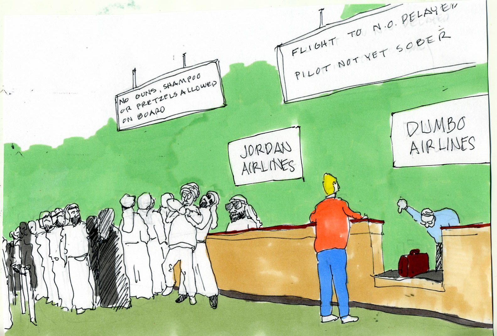 Ode to Air RageHere comes Summer, pick out an exotic resort It’s time for another Summertime vacation Purchased first-class tickets Departing Kennedy Airport Hawaii is my life-long destination Wearing all smiles Counting those Frequent Flyer Miles I’ve spent my entire, hard earned monthly wage But my name has been enlisted I’ve been unconsciously assisted To participate, in a lethal game, of Air Rage Ninety-five degrees and it is hot No parking space in the Kennedy parking lot Get rapid instructions in a language that is not discernible The next hour time really drags Trying to board three Samsonite loaded bags Now a ten minute race, to the departure airport terminal The ticket manager has little to say “Your reserved seats have been given away We might detour you through the lovely airport in Atlanta” A lucky twist in this sad story An empty seat next to the lavatory Pop a Prozac and a needed sip of your Mylanta The athletic stewardess with a grin Uses a crowbar to get your storage bag in Your 300 pound neighbor is not an example for sanitary fitness As the airplane’s tail zigs and zags You instantly reach for the barfing bags While your neighbor tries to convert you to Jehovah’s Witness The plane has landed, pure elation Maybe I can start enjoying my damn vacation Another tedious hour for the plane to dis-embark Inside this airport, it’s more the same Two hours to sit for your missing baggage claim Again the industry, has stranded the passenger, in the dark Finally you are starting to get annoyed Finding only one Samsonite bag and it’s all destroyed Air Rage continues, for another episode, when you land The flight ends, you are now in heaven The airlines soon, files under Chapter Eleven Get stranded for an hour now, at the Foreign Taxi Stand As you get into your Hotel bed Of the return flight you start to dread Next time you better think twice, and think hard I will never never engage In another battle, of psychotic Air Rage I’ll be camping out, in my own home, safe backyard Send this Whackocard to your friends! |