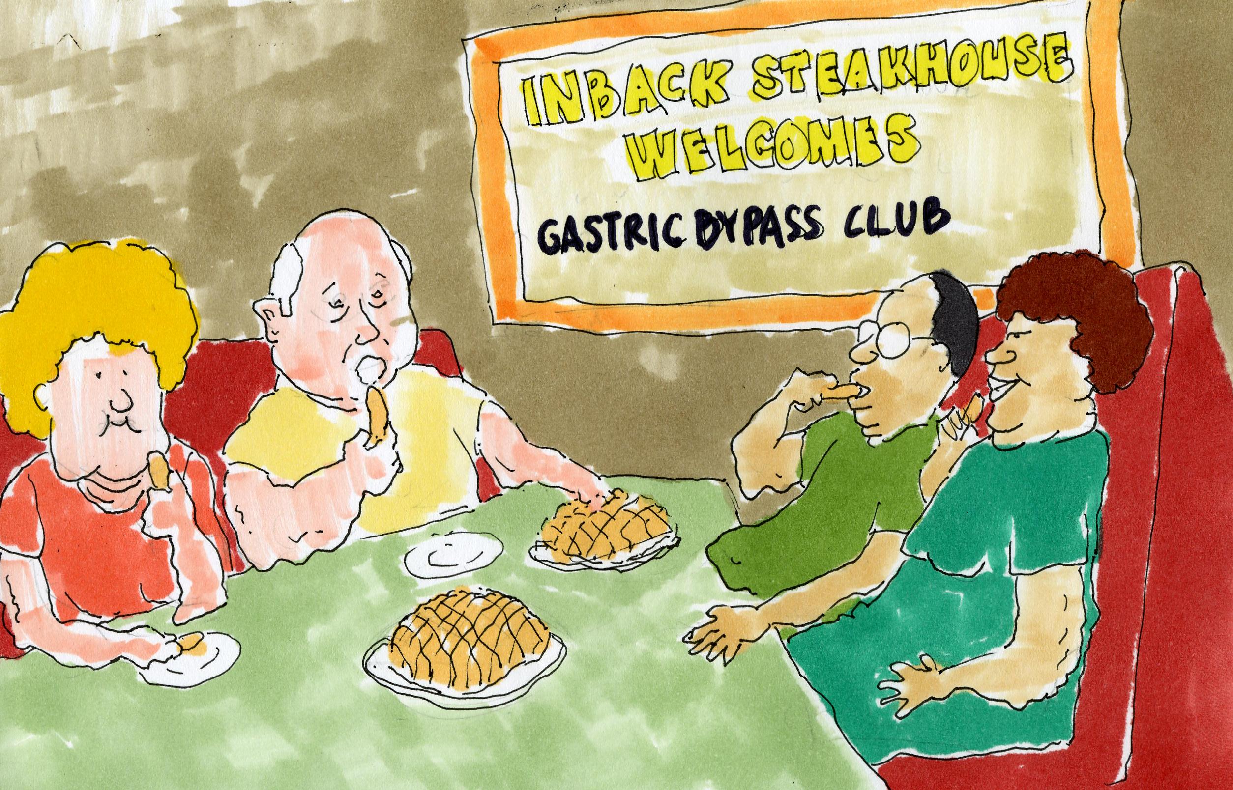Thank You for My Gastric BypassThank you for My Gastric Bypass Popeye’s chicken I can once again order The pounds have melted off my ass I no longer have an overweight disorder Once I was the neighborhood blimp Layers of adipose were collectively rollin’ I no longer walk with a side-winding limp Less activity now takes place in my colon My stomach was shortened with a clamp French Fries only regurgitate I walk the stairs, no longer wheeled on a ramp I live in Louisiana, the “Gastric Bypass”, famous state Exercise was deemed, a total waste of time My stomach was an accomplice of perjury My G.I. tract now accommodates, all “Fast Food” it can find God Bless, my sacred “Gastric Bypass Surgery” Fat grams, I was never, one to count Reading the entire menu, is no long the question The lasagna is coming, I ordered the large amount Who cares, if I have chronic indigestion? On the beach embarrassed, hid in a large beach towel Hear my loud and ominous , shoe sounds It’s amazing what happens, when you re-arrange your bowel Gastric Bypass will drop, fat pounds The compassionate doctor held my hand “We will use a device that is known as the Lap” I then got billed for ten thousand grand I lost weight, and lost the ability, to crap The Bypass has contributed to my new life’s lease Workouts at the gym, wasted months of my life A few stomach holes, and I’m no longer obese In just a few hours, asleep, under the knife So thank you for my Gastric Bypass It’s nice to be look like my peers I have enrolled myself in a culinary class Then enroll in a Gastric Bypass, once again, in a few years Send this Whackocard to your friends! |