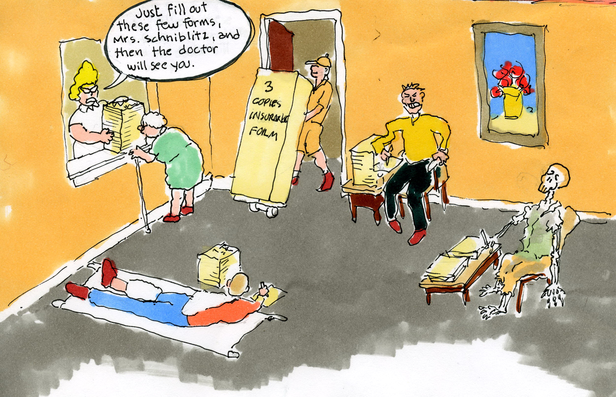 Ode to Your HMO #2I woke up this morning, with chills and throat hoarse I think I came down with the flu In a 30 page warning, deciphering my health-care course Instructions of what I should do "You must contact first your primary M.D." Uh-oh he's on a two week vacation "Unless you got a case of fatal V.D. all we can grant you is a full two days of sedation" "The verdict is not rigid, it can be appealed" My blood presssure is making me tipsy "Please don't be livid, but our answer is scaled you can argue with the director in Poughkeepsie" The number is dialed, the facts are neatly compiled My racing heart is now looking tachy-cardic "Your complaint has been filed, your illness judged as too mild I'm so sorry that you are feeling lethargic" Oh poor poor me, for only a two hundred dollar fee My insurance could have easily been upgraded "You are now under our control, here-come take two Tylenol be grateful- you should feel dated" I'm getting too thin, I can't afford my insulin The pharmacist will supply me no credit I've re-hit the gin, welfare days will begin Until then, I'll just feel decrepit You have no assurance, with a card of insurance Only a guarantee of a steep monthly bill Convalesce in your closet, for your hard earned deposit HMO's say it still pays to be ill Send this Whackocard to your friends! |